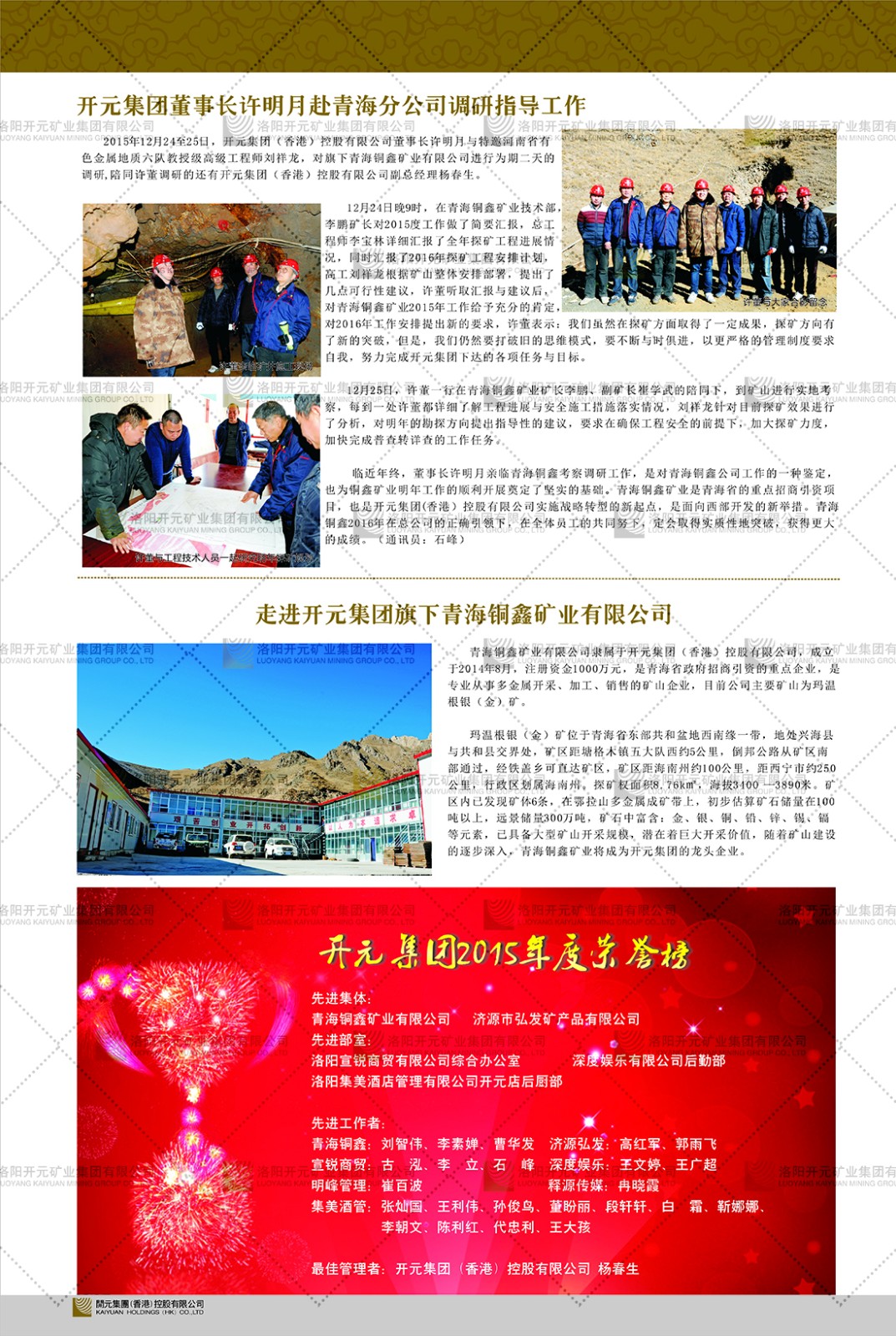洛陽開元礦業(yè)集團有限公司簡介洛陽開元礦業(yè)集團有限公司,始成立于2006年,位于洛陽市開元大道269號。集團旗下共有五余家全資子公司,業(yè)務涉及有色金屬礦山開發(fā)、礦產(chǎn)品購銷與進出口貿(mào)易、房地產(chǎn)開發(fā)、文化藝術(shù)、企業(yè)管理與咨詢、資本投資等多個領域。民建河南省委委員、民建河南省委企業(yè)委副主任、民建洛陽市委委員、企業(yè)委主任、洛陽民建企業(yè)家協(xié)會會長許明月是公司創(chuàng)始人,現(xiàn)任洛陽開元礦業(yè)集團有限公司董事長。在礦業(yè)領域,洛陽開元礦業(yè)集團擁有多家實力雄厚的子公司:貴州開元礦業(yè)有限公司探、采礦權(quán)面積共11.33平方公里;興海縣銅鑫礦業(yè)有限公司探礦權(quán)面積8.76平方公里,礦山資源潛力巨大;2021年,開元集團與盧氏中科礦業(yè)有限公司開展戰(zhàn)略合作。盧氏中科礦業(yè)有限公司專注于有色金屬的浮選、加工和銷售,擁有強大的技術(shù)支撐平臺,是集探、采、選、冶、研為一體的中大型綜合礦業(yè)企業(yè)。目前,盧氏中科王家河1000噸選礦廠已成功投產(chǎn),雙河金礦、柳關(guān)欒盧鉛鋅礦相繼順利開工,樓房銀礦與圪老灣鉛鋅礦的深部探礦重大突破,標志著礦山版圖取得重大進展,為開元集團后續(xù)發(fā)展奠定了堅實基礎。在文化傳媒領域,洛陽市明月美術(shù)館通過豐富多樣的藝術(shù)展覽、學術(shù)研討和公共教育活動,努力打造一個集展覽、交流、教育、研究為一體的綜合性藝術(shù)平臺。此外,在金融投資領域,開元集團旗下的北京明峰資本管理有限公司專注于投資具有高增長潛力的優(yōu)秀企業(yè),特別是高科技、新能源、環(huán)保等新興產(chǎn)業(yè),為客戶提供個性化的資產(chǎn)配置服務。在做好企業(yè)經(jīng)營的同時,開元集團始終不忘企業(yè)的社會責任和家國情懷,以突出的愛心公益事跡,開展了一系列公益慈善活動:“民建林”公益事業(yè)通過“思源基金”“幫幫公益”線上公益平臺,與眾多愛心人士籌措資金20余萬元;資助541名貧困大學生共計270余萬元,推進“數(shù)字助力——河南AI人才培養(yǎng)”;捐款10萬元,馳援京津冀、黑龍江洪水地質(zhì)災害……公司于2017年底被洛陽市慈善總會評為“洛陽慈善風云榜——十大愛心集體”。洛陽開元礦業(yè)集團有限公司秉承持續(xù)發(fā)展理念,憑借多年來良好的企業(yè)信譽與經(jīng)營業(yè)績,與全國多家企業(yè)建立了良好合作關(guān)系,受到社會各界的一致好評,多次榮獲“納稅標兵”“先進企業(yè)”“招商引資模范企業(yè)”等榮譽稱號?;赝麃頃r路,開元人勠力同心,以“闖”的精神和“創(chuàng)”的勁頭,一路披荊斬棘,踏過千山萬水;展望新未來,開元人凝心聚力,不執(zhí)于“舊”,無畏于“新”,秉承“勇于跨越,追求卓越”的企業(yè)精神,乘著國家高質(zhì)量發(fā)展新征程的東風,跨過高山,越過大海,向著集團多元化、國際化的目標,逐夢遠航,跨越前行!