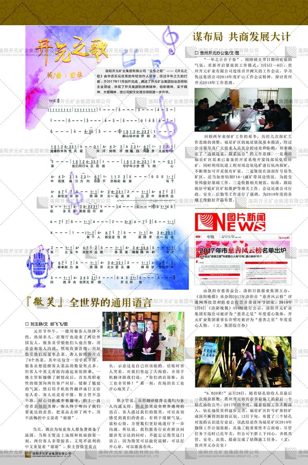 洛陽(yáng)開(kāi)元礦業(yè)集團(tuán)有限公司簡(jiǎn)介洛陽(yáng)開(kāi)元礦業(yè)集團(tuán)有限公司,始成立于2006年,位于洛陽(yáng)市開(kāi)元大道269號(hào)。集團(tuán)旗下共有五余家全資子公司,業(yè)務(wù)涉及有色金屬礦山開(kāi)發(fā)、礦產(chǎn)品購(gòu)銷(xiāo)與進(jìn)出口貿(mào)易、房地產(chǎn)開(kāi)發(fā)、文化藝術(shù)、企業(yè)管理與咨詢(xún)、資本投資等多個(gè)領(lǐng)域。民建河南省委委員、民建河南省委企業(yè)委副主任、民建洛陽(yáng)市委委員、企業(yè)委主任、洛陽(yáng)民建企業(yè)家協(xié)會(huì)會(huì)長(zhǎng)許明月是公司創(chuàng)始人,現(xiàn)任洛陽(yáng)開(kāi)元礦業(yè)集團(tuán)有限公司董事長(zhǎng)。在礦業(yè)領(lǐng)域,洛陽(yáng)開(kāi)元礦業(yè)集團(tuán)擁有多家實(shí)力雄厚的子公司:貴州開(kāi)元礦業(yè)有限公司探、采礦權(quán)面積共11.33平方公里;興海縣銅鑫礦業(yè)有限公司探礦權(quán)面積8.76平方公里,礦山資源潛力巨大;2021年,開(kāi)元集團(tuán)與盧氏中科礦業(yè)有限公司開(kāi)展戰(zhàn)略合作。盧氏中科礦業(yè)有限公司專(zhuān)注于有色金屬的浮選、加工和銷(xiāo)售,擁有強(qiáng)大的技術(shù)支撐平臺(tái),是集探、采、選、冶、研為一體的中大型綜合礦業(yè)企業(yè)。目前,盧氏中科王家河1000噸選礦廠已成功投產(chǎn),雙河金礦、柳關(guān)欒盧鉛鋅礦相繼順利開(kāi)工,樓房銀礦與圪老灣鉛鋅礦的深部探礦重大突破,標(biāo)志著礦山版圖取得重大進(jìn)展,為開(kāi)元集團(tuán)后續(xù)發(fā)展奠定了堅(jiān)實(shí)基礎(chǔ)。在文化傳媒領(lǐng)域,洛陽(yáng)市明月美術(shù)館通過(guò)豐富多樣的藝術(shù)展覽、學(xué)術(shù)研討和公共教育活動(dòng),努力打造一個(gè)集展覽、交流、教育、研究為一體的綜合性藝術(shù)平臺(tái)。此外,在金融投資領(lǐng)域,開(kāi)元集團(tuán)旗下的北京明峰資本管理有限公司專(zhuān)注于投資具有高增長(zhǎng)潛力的優(yōu)秀企業(yè),特別是高科技、新能源、環(huán)保等新興產(chǎn)業(yè),為客戶(hù)提供個(gè)性化的資產(chǎn)配置服務(wù)。在做好企業(yè)經(jīng)營(yíng)的同時(shí),開(kāi)元集團(tuán)始終不忘企業(yè)的社會(huì)責(zé)任和家國(guó)情懷,以突出的愛(ài)心公益事跡,開(kāi)展了一系列公益慈善活動(dòng):“民建林”公益事業(yè)通過(guò)“思源基金”“幫幫公益”線上公益平臺(tái),與眾多愛(ài)心人士籌措資金20余萬(wàn)元;資助541名貧困大學(xué)生共計(jì)270余萬(wàn)元,推進(jìn)“數(shù)字助力——河南AI人才培養(yǎng)”;捐款10萬(wàn)元,馳援京津冀、黑龍江洪水地質(zhì)災(zāi)害……公司于2017年底被洛陽(yáng)市慈善總會(huì)評(píng)為“洛陽(yáng)慈善風(fēng)云榜——十大愛(ài)心集體”。洛陽(yáng)開(kāi)元礦業(yè)集團(tuán)有限公司秉承持續(xù)發(fā)展理念,憑借多年來(lái)良好的企業(yè)信譽(yù)與經(jīng)營(yíng)業(yè)績(jī),與全國(guó)多家企業(yè)建立了良好合作關(guān)系,受到社會(huì)各界的一致好評(píng),多次榮獲“納稅標(biāo)兵”“先進(jìn)企業(yè)”“招商引資模范企業(yè)”等榮譽(yù)稱(chēng)號(hào)。回望來(lái)時(shí)路,開(kāi)元人勠力同心,以“闖”的精神和“創(chuàng)”的勁頭,一路披荊斬棘,踏過(guò)千山萬(wàn)水;展望新未來(lái),開(kāi)元人凝心聚力,不執(zhí)于“舊”,無(wú)畏于“新”,秉承“勇于跨越,追求卓越”的企業(yè)精神,乘著國(guó)家高質(zhì)量發(fā)展新征程的東風(fēng),跨過(guò)高山,越過(guò)大海,向著集團(tuán)多元化、國(guó)際化的目標(biāo),逐夢(mèng)遠(yuǎn)航,跨越前行!