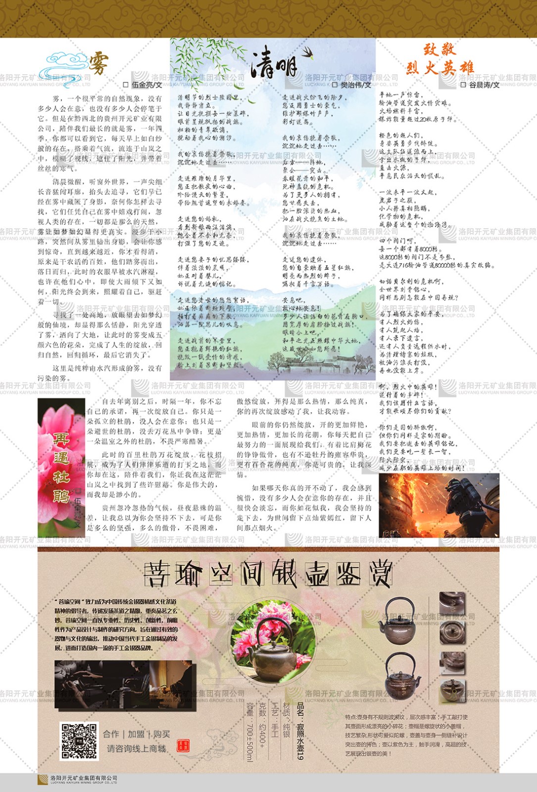 洛陽開元礦業(yè)集團有限公司簡介洛陽開元礦業(yè)集團有限公司,始成立于2006年,位于洛陽市開元大道269號。集團旗下共有五余家全資子公司,業(yè)務涉及有色金屬礦山開發(fā)、礦產(chǎn)品購銷與進出口貿(mào)易、房地產(chǎn)開發(fā)、文化藝術(shù)、企業(yè)管理與咨詢、資本投資等多個領(lǐng)域。民建河南省委委員、民建河南省委企業(yè)委副主任、民建洛陽市委委員、企業(yè)委主任、洛陽民建企業(yè)家協(xié)會會長許明月是公司創(chuàng)始人,現(xiàn)任洛陽開元礦業(yè)集團有限公司董事長。在礦業(yè)領(lǐng)域,洛陽開元礦業(yè)集團擁有多家實力雄厚的子公司:貴州開元礦業(yè)有限公司探、采礦權(quán)面積共11.33平方公里;興??h銅鑫礦業(yè)有限公司探礦權(quán)面積8.76平方公里,礦山資源潛力巨大;2021年,開元集團與盧氏中科礦業(yè)有限公司開展戰(zhàn)略合作。盧氏中科礦業(yè)有限公司專注于有色金屬的浮選、加工和銷售,擁有強大的技術(shù)支撐平臺,是集探、采、選、冶、研為一體的中大型綜合礦業(yè)企業(yè)。目前,盧氏中科王家河1000噸選礦廠已成功投產(chǎn),雙河金礦、柳關(guān)欒盧鉛鋅礦相繼順利開工,樓房銀礦與圪老灣鉛鋅礦的深部探礦重大突破,標志著礦山版圖取得重大進展,為開元集團后續(xù)發(fā)展奠定了堅實基礎。在文化傳媒領(lǐng)域,洛陽市明月美術(shù)館通過豐富多樣的藝術(shù)展覽、學術(shù)研討和公共教育活動,努力打造一個集展覽、交流、教育、研究為一體的綜合性藝術(shù)平臺。此外,在金融投資領(lǐng)域,開元集團旗下的北京明峰資本管理有限公司專注于投資具有高增長潛力的優(yōu)秀企業(yè),特別是高科技、新能源、環(huán)保等新興產(chǎn)業(yè),為客戶提供個性化的資產(chǎn)配置服務。在做好企業(yè)經(jīng)營的同時,開元集團始終不忘企業(yè)的社會責任和家國情懷,以突出的愛心公益事跡,開展了一系列公益慈善活動:“民建林”公益事業(yè)通過“思源基金”“幫幫公益”線上公益平臺,與眾多愛心人士籌措資金20余萬元;資助541名貧困大學生共計270余萬元,推進“數(shù)字助力——河南AI人才培養(yǎng)”;捐款10萬元,馳援京津冀、黑龍江洪水地質(zhì)災害……公司于2017年底被洛陽市慈善總會評為“洛陽慈善風云榜——十大愛心集體”。洛陽開元礦業(yè)集團有限公司秉承持續(xù)發(fā)展理念,憑借多年來良好的企業(yè)信譽與經(jīng)營業(yè)績,與全國多家企業(yè)建立了良好合作關(guān)系,受到社會各界的一致好評,多次榮獲“納稅標兵”“先進企業(yè)”“招商引資模范企業(yè)”等榮譽稱號?;赝麃頃r路,開元人勠力同心,以“闖”的精神和“創(chuàng)”的勁頭,一路披荊斬棘,踏過千山萬水;展望新未來,開元人凝心聚力,不執(zhí)于“舊”,無畏于“新”,秉承“勇于跨越,追求卓越”的企業(yè)精神,乘著國家高質(zhì)量發(fā)展新征程的東風,跨過高山,越過大海,向著集團多元化、國際化的目標,逐夢遠航,跨越前行!