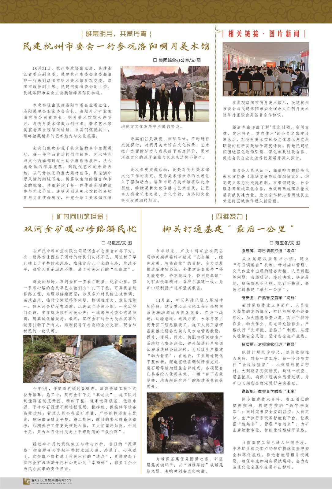 洛陽開元礦業(yè)集團有限公司簡介洛陽開元礦業(yè)集團有限公司,始成立于2006年,位于洛陽市開元大道269號。集團旗下共有五余家全資子公司,業(yè)務涉及有色金屬礦山開發(fā)、礦產品購銷與進出口貿易、房地產開發(fā)、文化藝術、企業(yè)管理與咨詢、資本投資等多個領域。民建河南省委委員、民建河南省委企業(yè)委副主任、民建洛陽市委委員、企業(yè)委主任、洛陽民建企業(yè)家協(xié)會會長許明月是公司創(chuàng)始人,現(xiàn)任洛陽開元礦業(yè)集團有限公司董事長。在礦業(yè)領域,洛陽開元礦業(yè)集團擁有多家實力雄厚的子公司:貴州開元礦業(yè)有限公司探、采礦權面積共11.33平方公里;興??h銅鑫礦業(yè)有限公司探礦權面積8.76平方公里,礦山資源潛力巨大;2021年,開元集團與盧氏中科礦業(yè)有限公司開展戰(zhàn)略合作。盧氏中科礦業(yè)有限公司專注于有色金屬的浮選、加工和銷售,擁有強大的技術支撐平臺,是集探、采、選、冶、研為一體的中大型綜合礦業(yè)企業(yè)。目前,盧氏中科王家河1000噸選礦廠已成功投產,雙河金礦、柳關欒盧鉛鋅礦相繼順利開工,樓房銀礦與圪老灣鉛鋅礦的深部探礦重大突破,標志著礦山版圖取得重大進展,為開元集團后續(xù)發(fā)展奠定了堅實基礎。在文化傳媒領域,洛陽市明月美術館通過豐富多樣的藝術展覽、學術研討和公共教育活動,努力打造一個集展覽、交流、教育、研究為一體的綜合性藝術平臺。此外,在金融投資領域,開元集團旗下的北京明峰資本管理有限公司專注于投資具有高增長潛力的優(yōu)秀企業(yè),特別是高科技、新能源、環(huán)保等新興產業(yè),為客戶提供個性化的資產配置服務。在做好企業(yè)經營的同時,開元集團始終不忘企業(yè)的社會責任和家國情懷,以突出的愛心公益事跡,開展了一系列公益慈善活動:“民建林”公益事業(yè)通過“思源基金”“幫幫公益”線上公益平臺,與眾多愛心人士籌措資金20余萬元;資助541名貧困大學生共計270余萬元,推進“數字助力——河南AI人才培養(yǎng)”;捐款10萬元,馳援京津冀、黑龍江洪水地質災害……公司于2017年底被洛陽市慈善總會評為“洛陽慈善風云榜——十大愛心集體”。洛陽開元礦業(yè)集團有限公司秉承持續(xù)發(fā)展理念,憑借多年來良好的企業(yè)信譽與經營業(yè)績,與全國多家企業(yè)建立了良好合作關系,受到社會各界的一致好評,多次榮獲“納稅標兵”“先進企業(yè)”“招商引資模范企業(yè)”等榮譽稱號。回望來時路,開元人勠力同心,以“闖”的精神和“創(chuàng)”的勁頭,一路披荊斬棘,踏過千山萬水;展望新未來,開元人凝心聚力,不執(zhí)于“舊”,無畏于“新”,秉承“勇于跨越,追求卓越”的企業(yè)精神,乘著國家高質量發(fā)展新征程的東風,跨過高山,越過大海,向著集團多元化、國際化的目標,逐夢遠航,跨越前行!