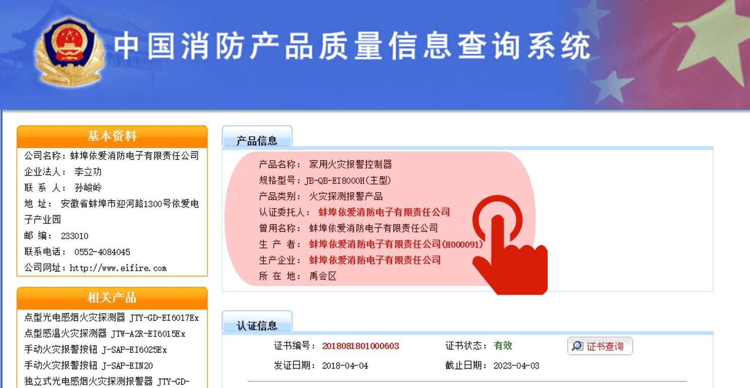 Nh?p vào s?n ph?m có liên quan ?? ki?m tra ch?ng ch? 3C m?i nh?t và d? li?u báo cáo ki?m tra, ch?ng h?n nh? nh?p vào "Home Fire Alarm Controller".